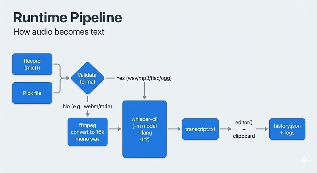 - Test both “record new clip” and “existing file” paths; validate failures when the model file/whisper-cli are missing or mic permission is denied. Confirm unsupported audio formats prompt for a supported re-record/selection (no ffmpeg fallback).