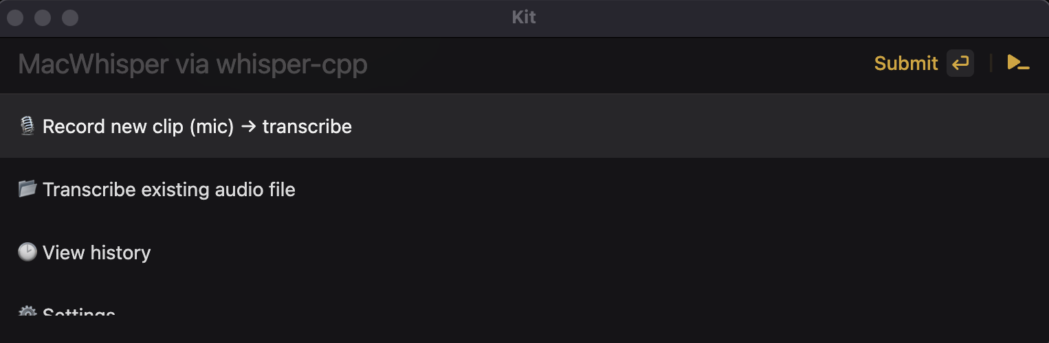 - Create a script (e.g., `scripts/macwhisper.ts`) with `import "@johnlindquist/kit"`.